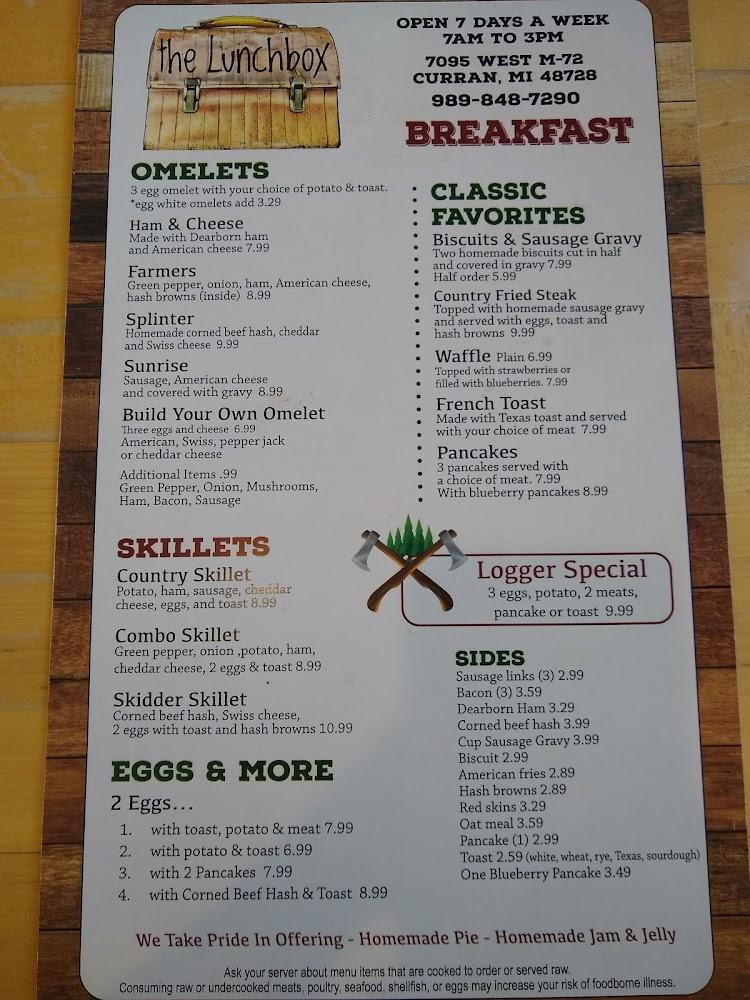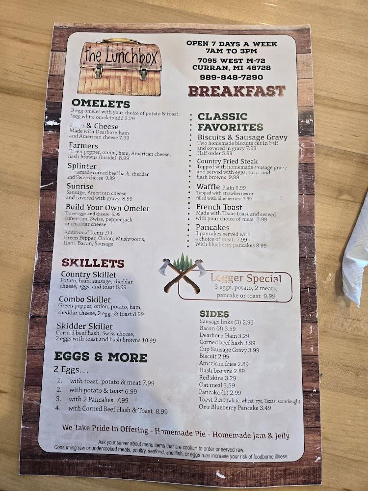 Welcome to The Lunchbox of Curran, your cozy family restaurant and café nestled in the heart of Curran, MI. With a delightful menu featuring excellent coffee, delectable desserts, and a range of local specialties, we cater to every meal of the day, from breakfast to dinner. Enjoy our relaxed ambiance, ideal for solo diners, families, and groups alike. We offer convenient takeout, dine-in, and delivery services, along with wheelchair accessibility and child-friendly options. Come share a meal with us, and experience the warmth and hospitality that makes The Lunchbox a local favorite!